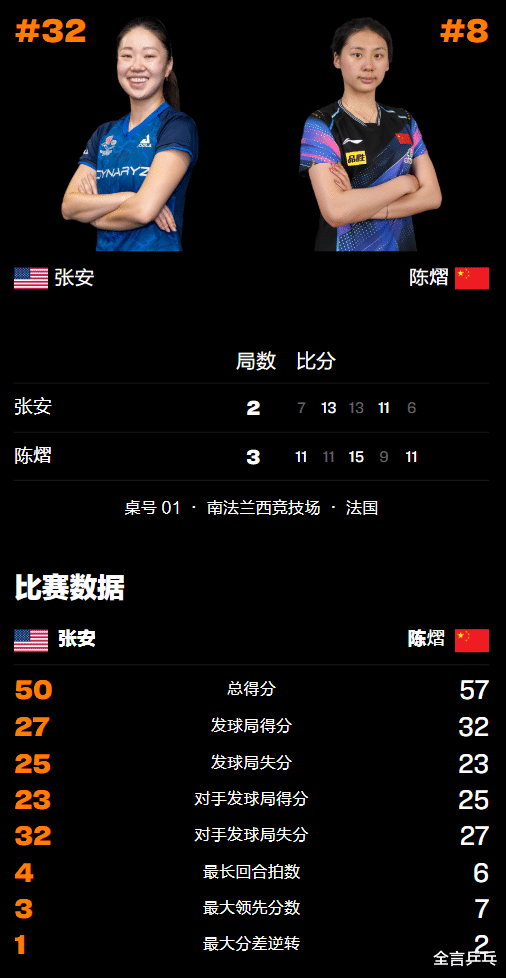 第二局张安打出了自己在近台的衔接速度,随即在开局取得领先优势,但陈熠很快便咬住比分并战平对手,8-8后陈熠接发球出现机会被抢攻连丢2分出现局点但很快追至10-10平,紧接着10-11再次战平后未能把握住机会,最终以11-13惜败被张安扳回一城。