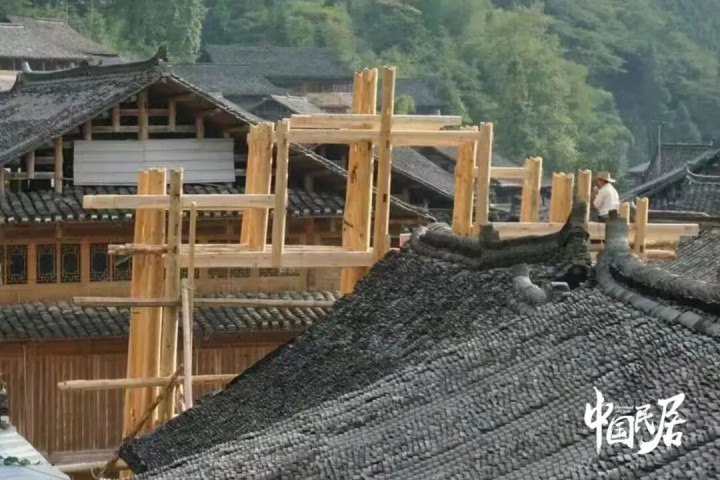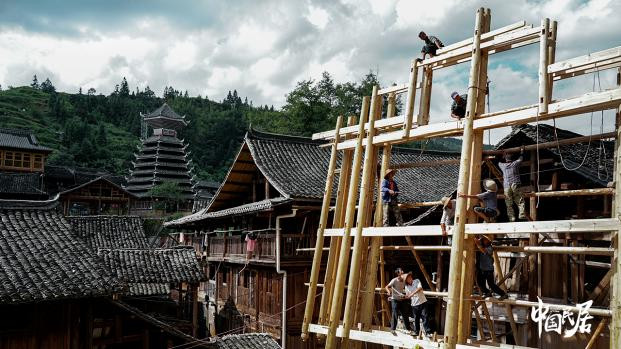 《中国民居》第三季开篇,拍的是近年爆火的贵州侗寨。从百名村民上山采原木,到掌墨师用鲁班符号给柱梁编号,再到工人用轮滑杠杆来组装木屋……随着镜头的推移,侗族房屋的诞生就徐徐展现在观众眼前。