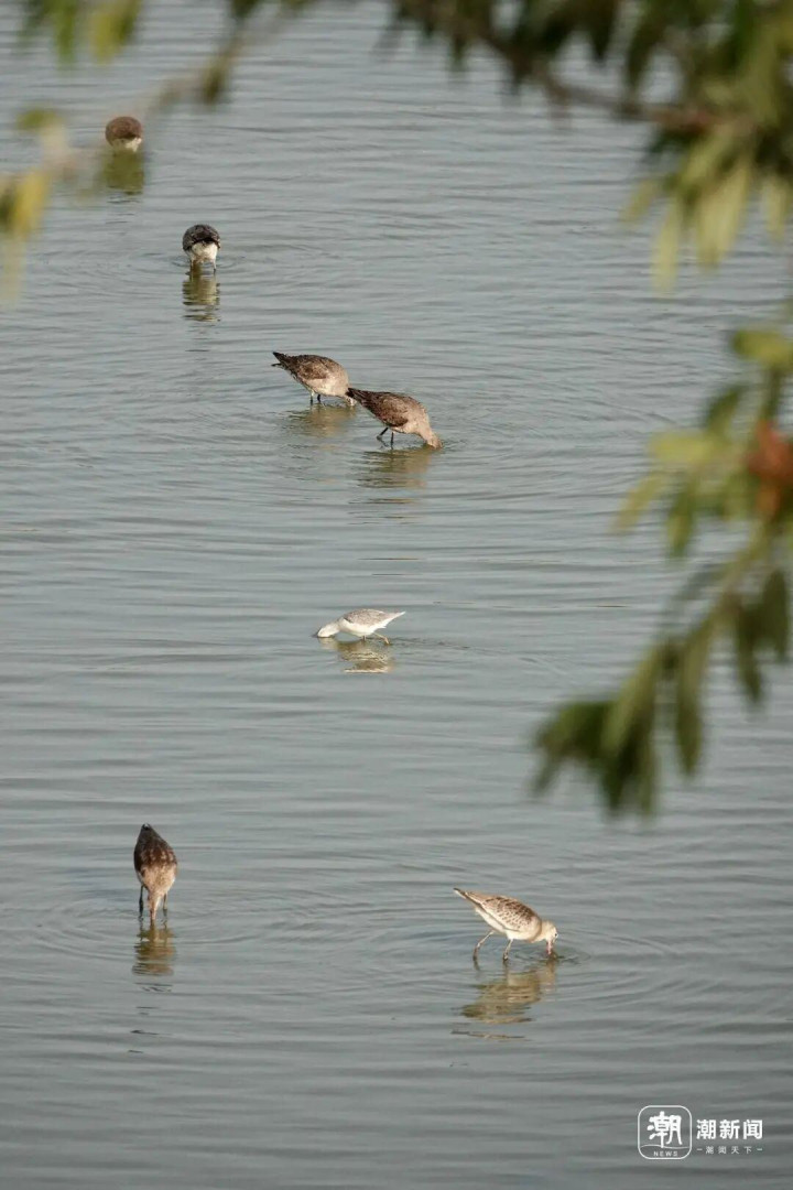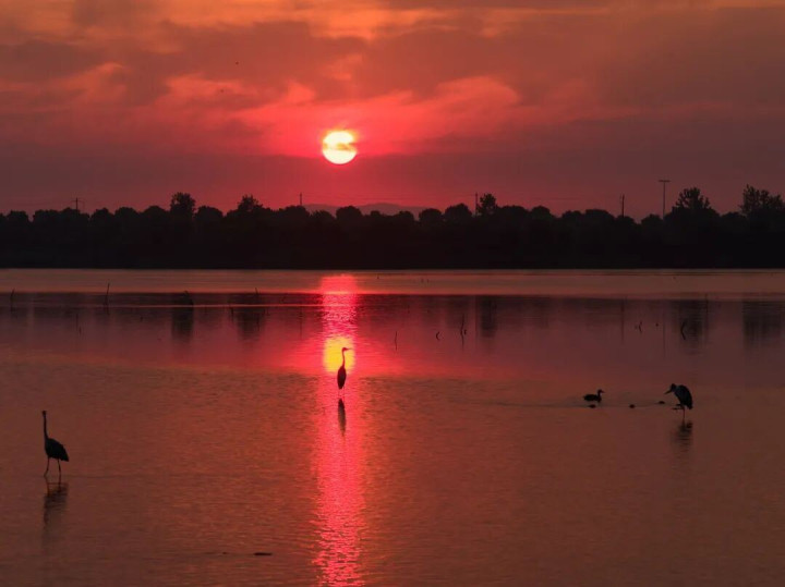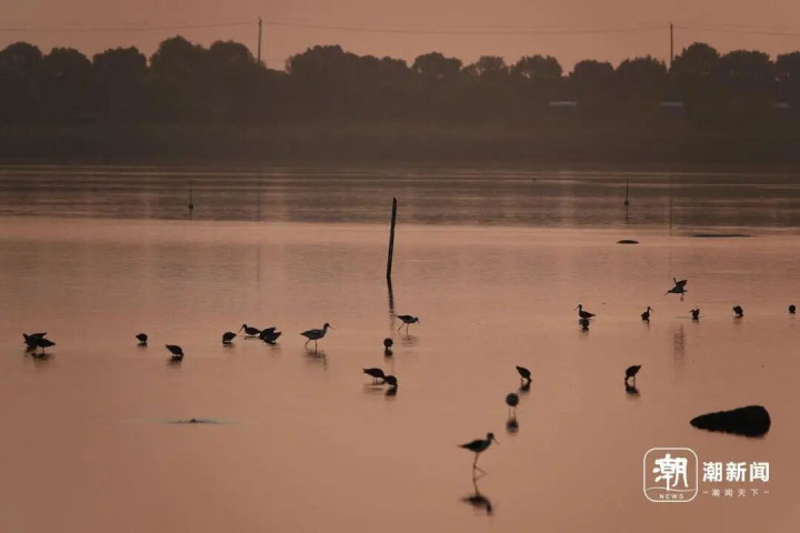 7点左右,朝霞褪去后,还能在木栈道听黑翅长脚鹬、白鹭的啼鸣,看湖面泛金光,感受湿地清晨的静谧。