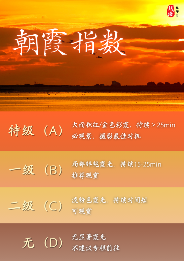 “朝霞指数”综合了云层厚度、湿度、能见度等气象数据,结合湿地独特地貌,划分为4个等级(如图)。