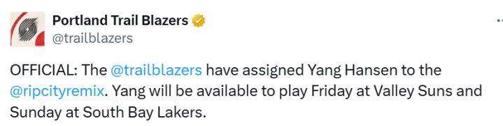 开拓者官宣下放杨瀚森: 本周六迎发展联盟首秀 将连续出战太阳湖人