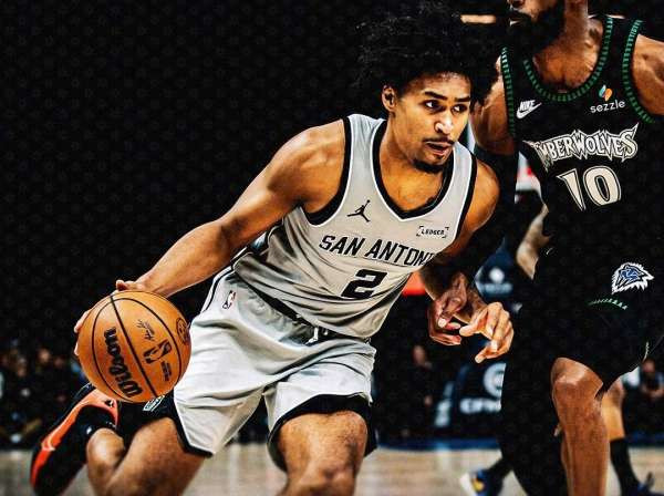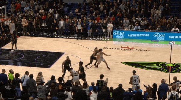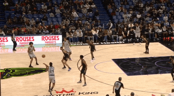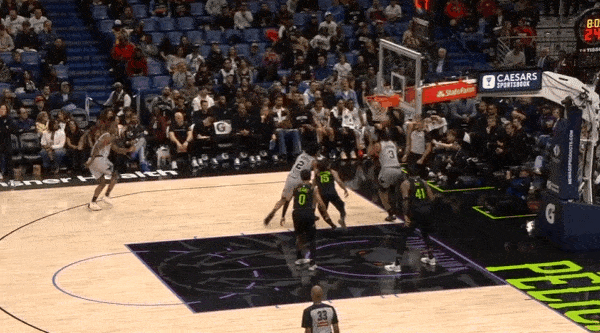 混乱局面下底角接球单打琼斯,前脚“挖步”衔接交叉步沿底线启动突破的同时对抗撞开琼斯,直杀篮下后迎着协防的奎因起跳滞空极限勾手打进。