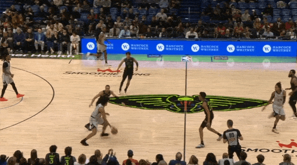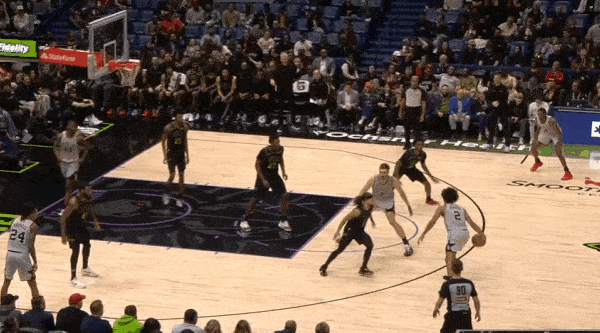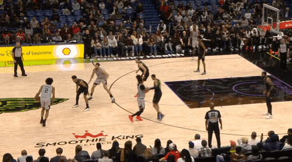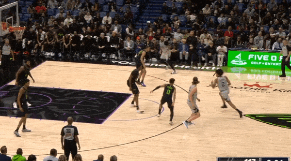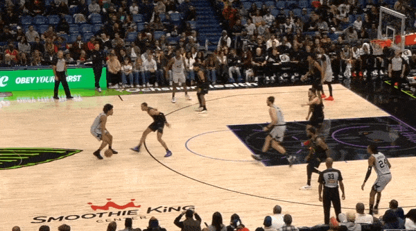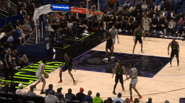 上个回合鹈鹕通过2-2-1全场紧逼尝到甜头(造成失误并打成反击),这个回合继续2-1-2全场紧逼:哈珀拿球控场,从容不迫的利用节奏变化推过半场后直接找到左翼空位的巴恩斯。