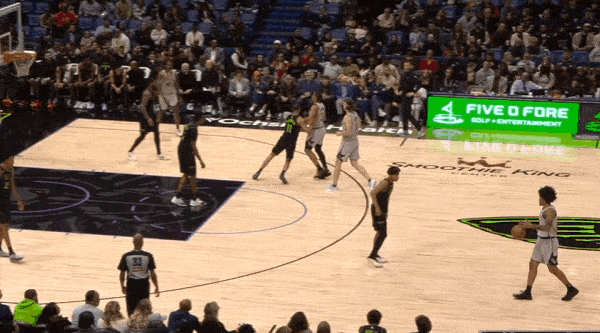 挡拆行进间走Z字形将追防人卡在身后,强对抗直接撞飞麦格文斯后变向换到左手,先起步后合球左手挑篮打进。
